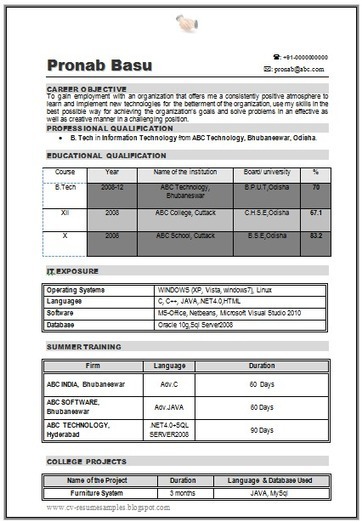 Resume Template For Btech Freshers