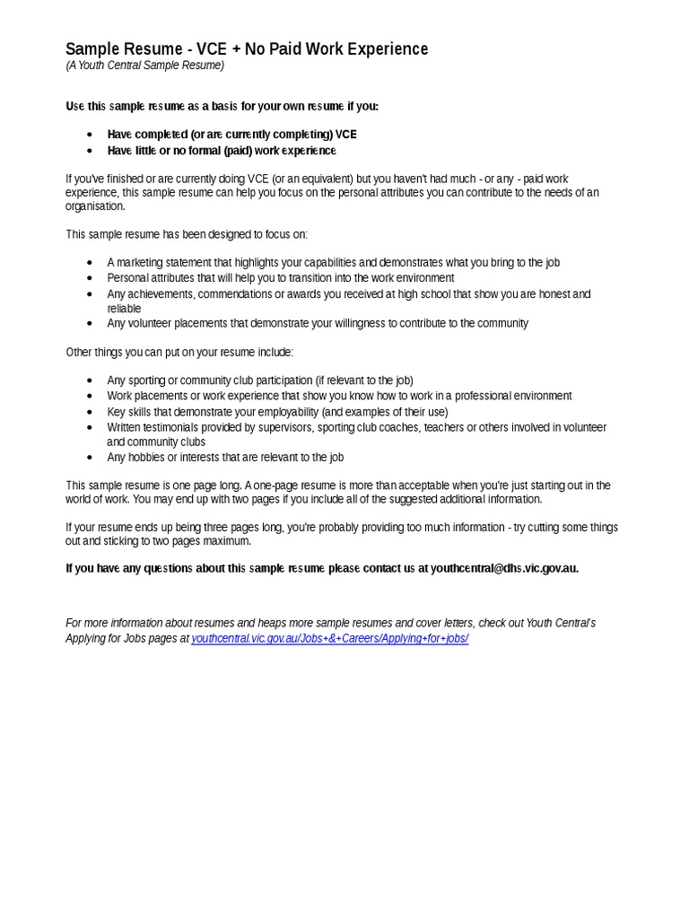 Uni or tafe no work experience. Sample resume vce no paid work experience a youth central sample resume use this sample resume as a basis for your own resume if you. Cv resume writing tips tutors field blog from vce student resume.